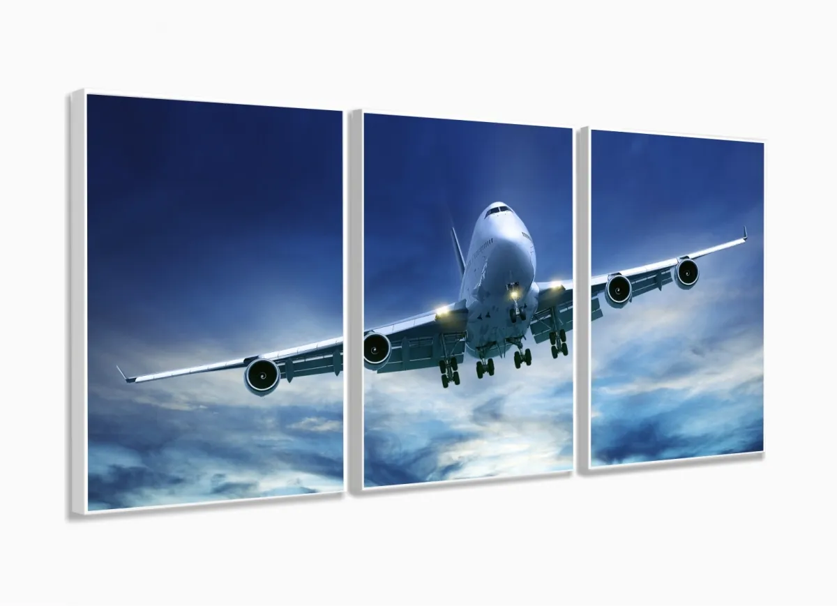 Quadro Decorativo Avião Aviação Céu Em Tecido 3 Peças 120x60 com moldura filete