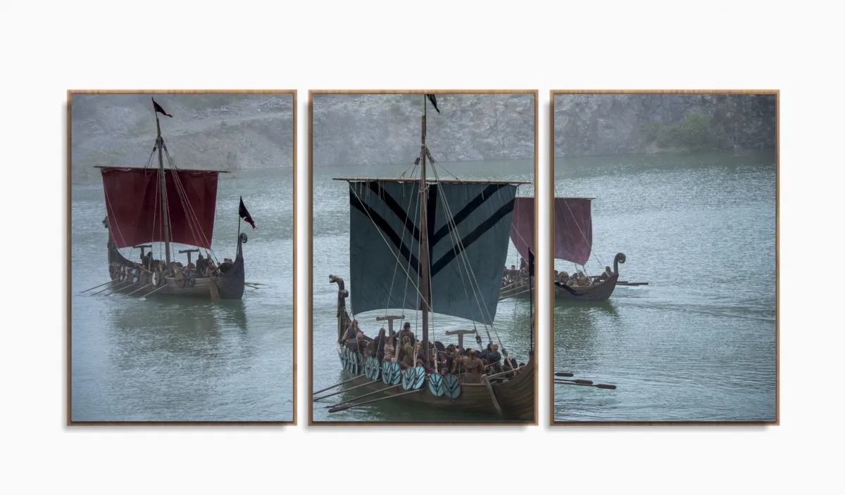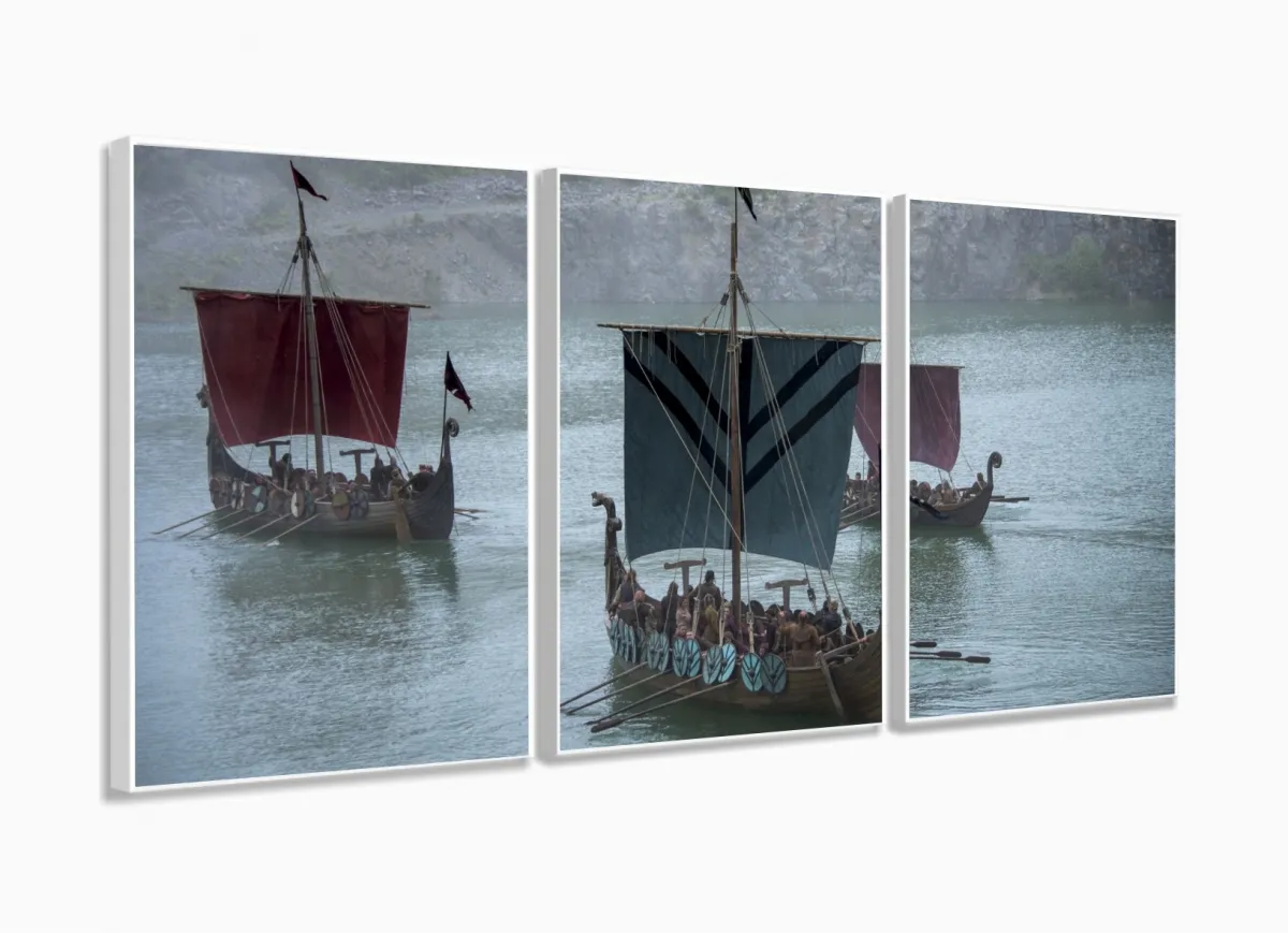Quadro Decorativo Barco Da Série Vikings Sala Tecido 3 Peças com moldura filete