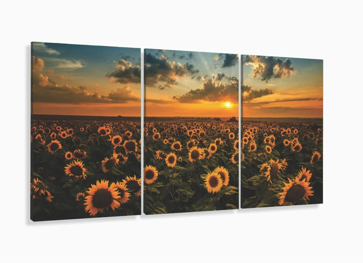 Quadro Decorativo Campo De Girassóis Entardecer 3 Peças com moldura filete