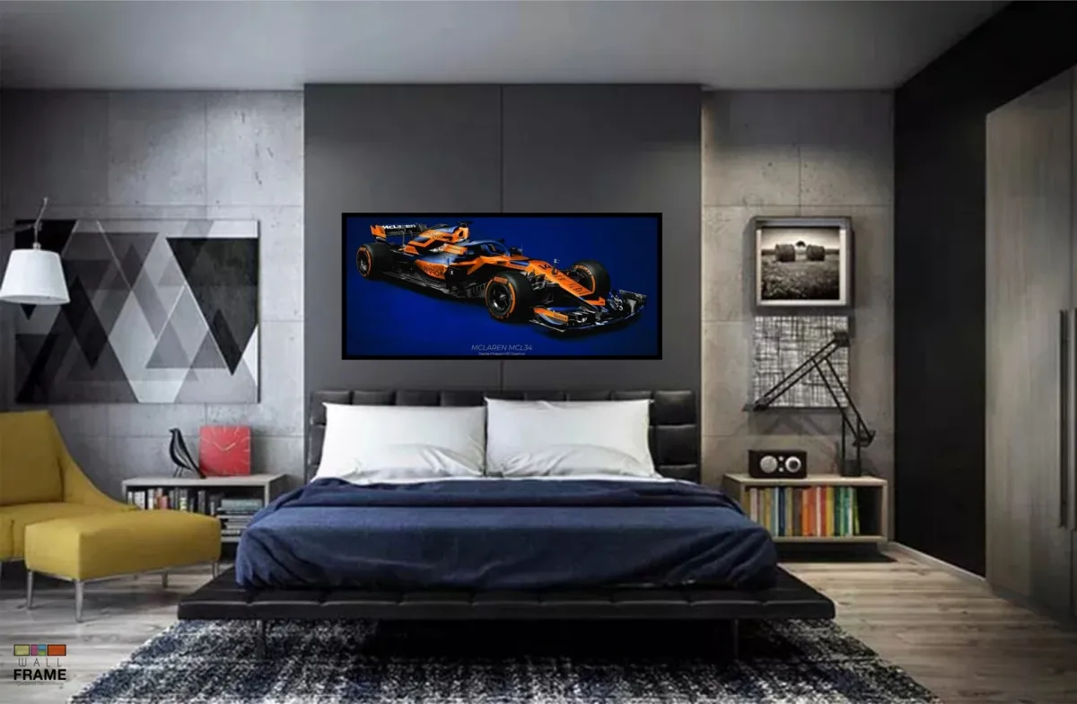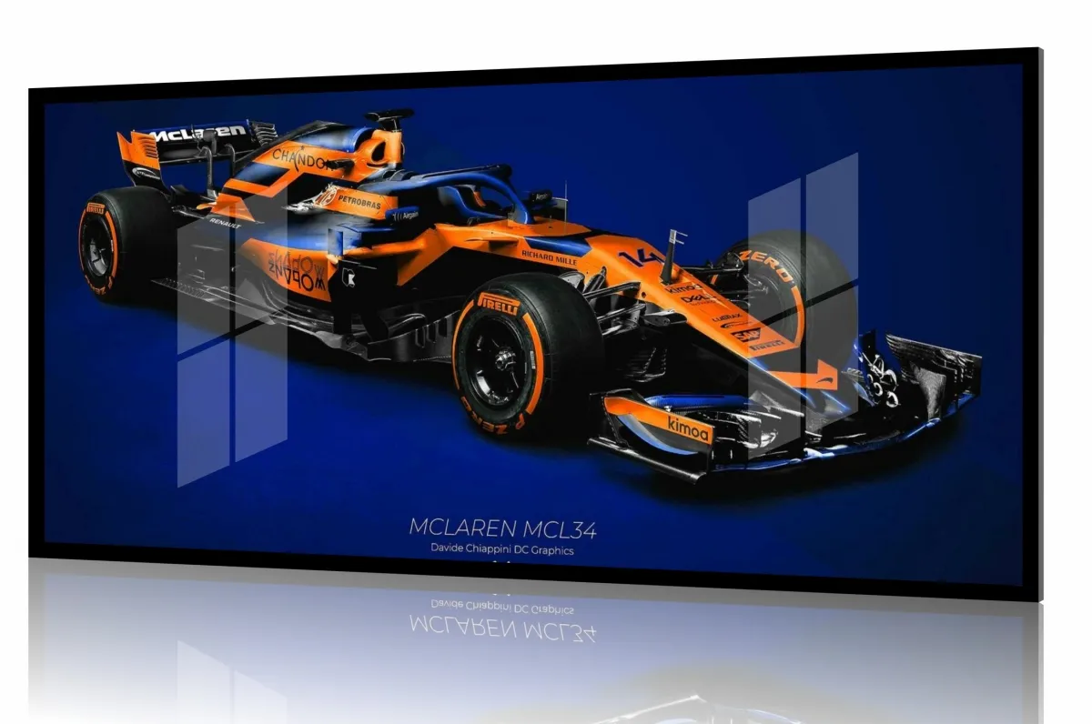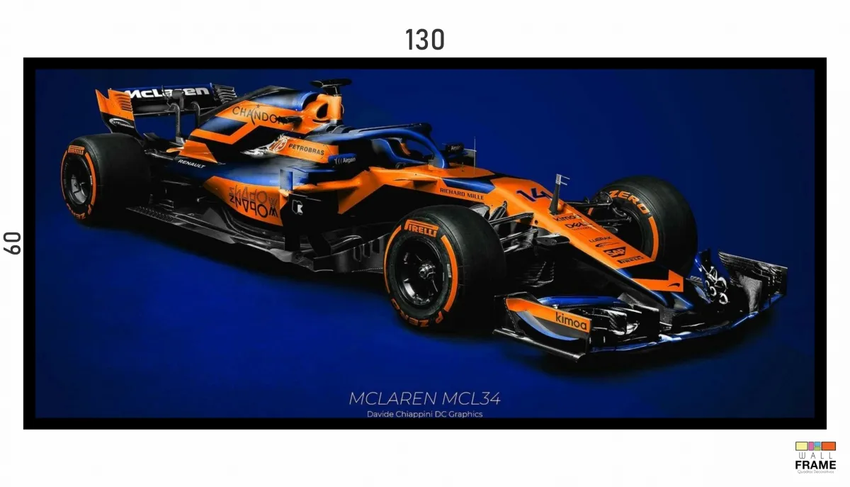 Quadro Decorativo Carro F1 MClaren MCL34 Corrida 130x60 moldura preta 2x2 cm