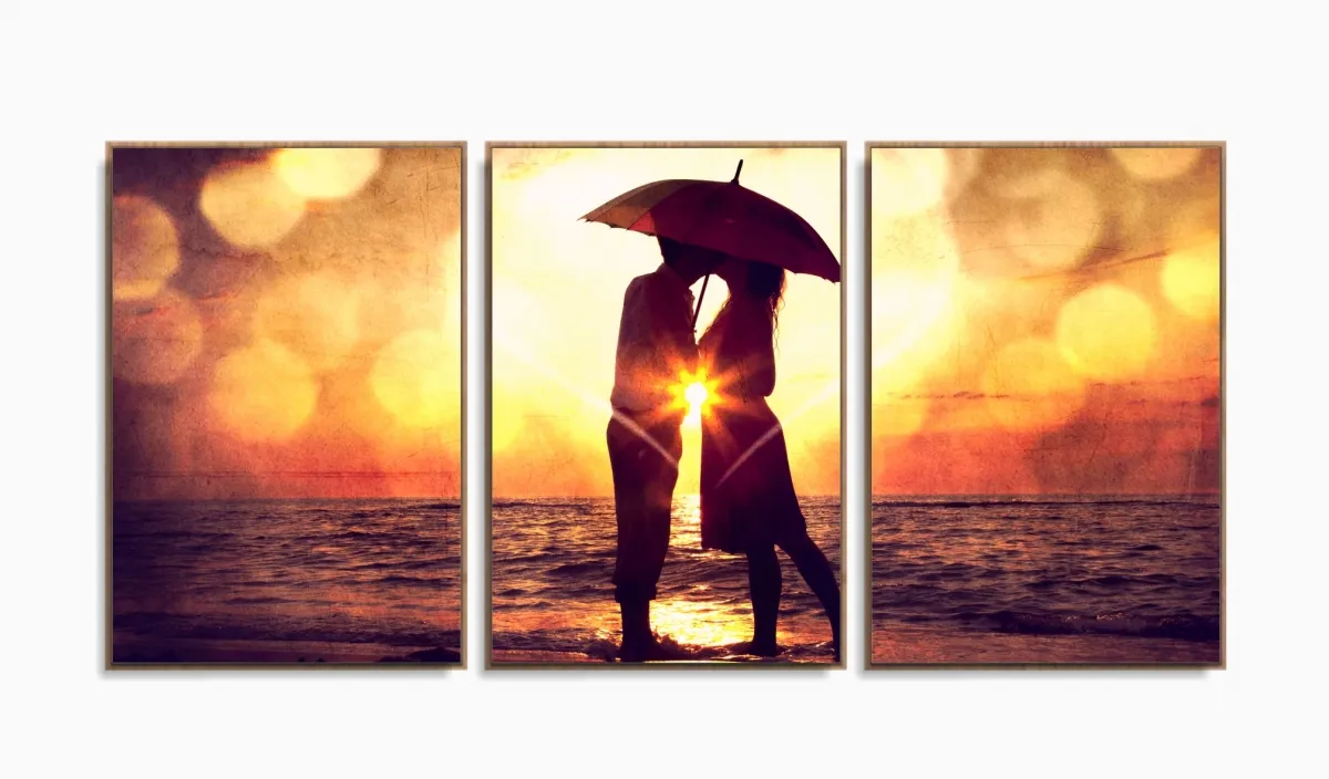 Quadro Decorativo Casal Guarda Chuva 120x60 3 peças Sala Quarto com moldura filete