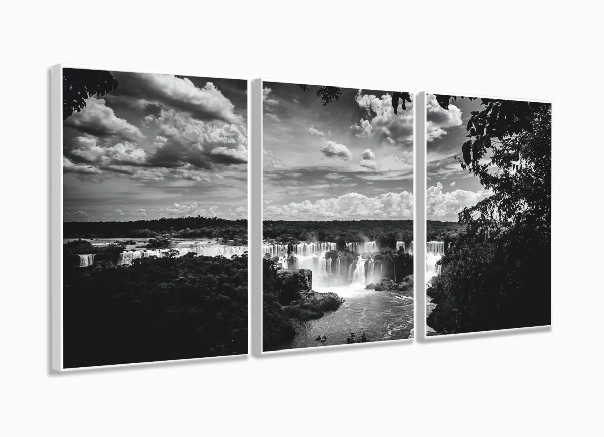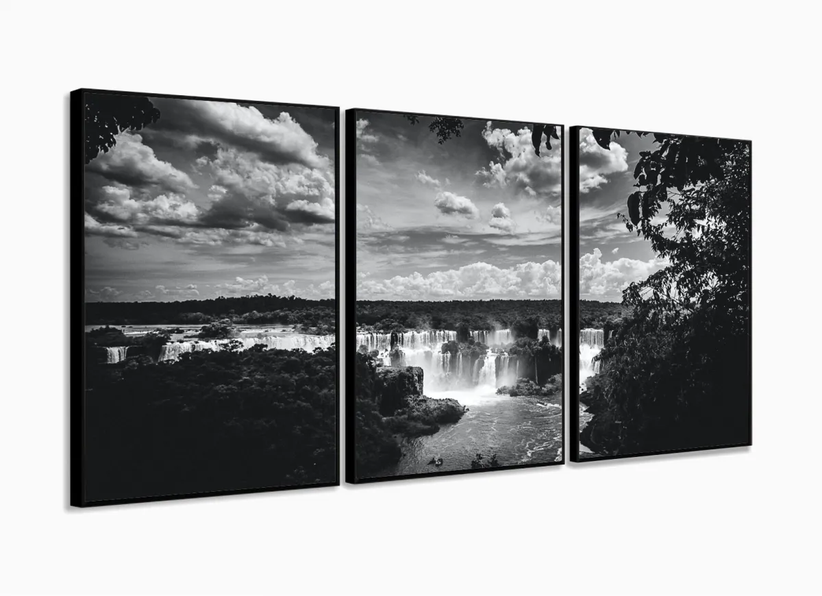 Quadro Decorativo Cataratas Do Iguaçu Preto E Branco - 3 peças 120x60 em tecido com moldura filete