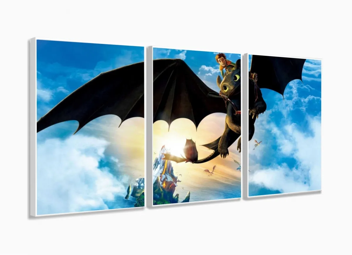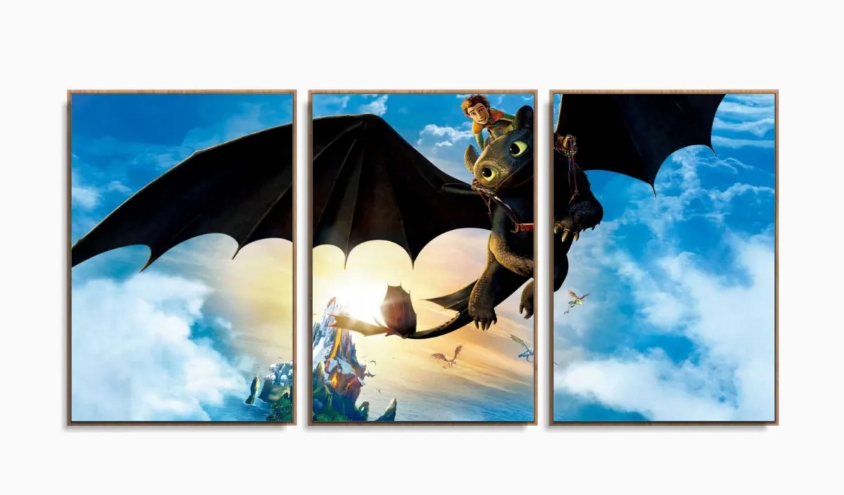 Quadro Decorativo Como Treinar Seu Dragao2 3 Peças 120x60 Cm com moldura filete