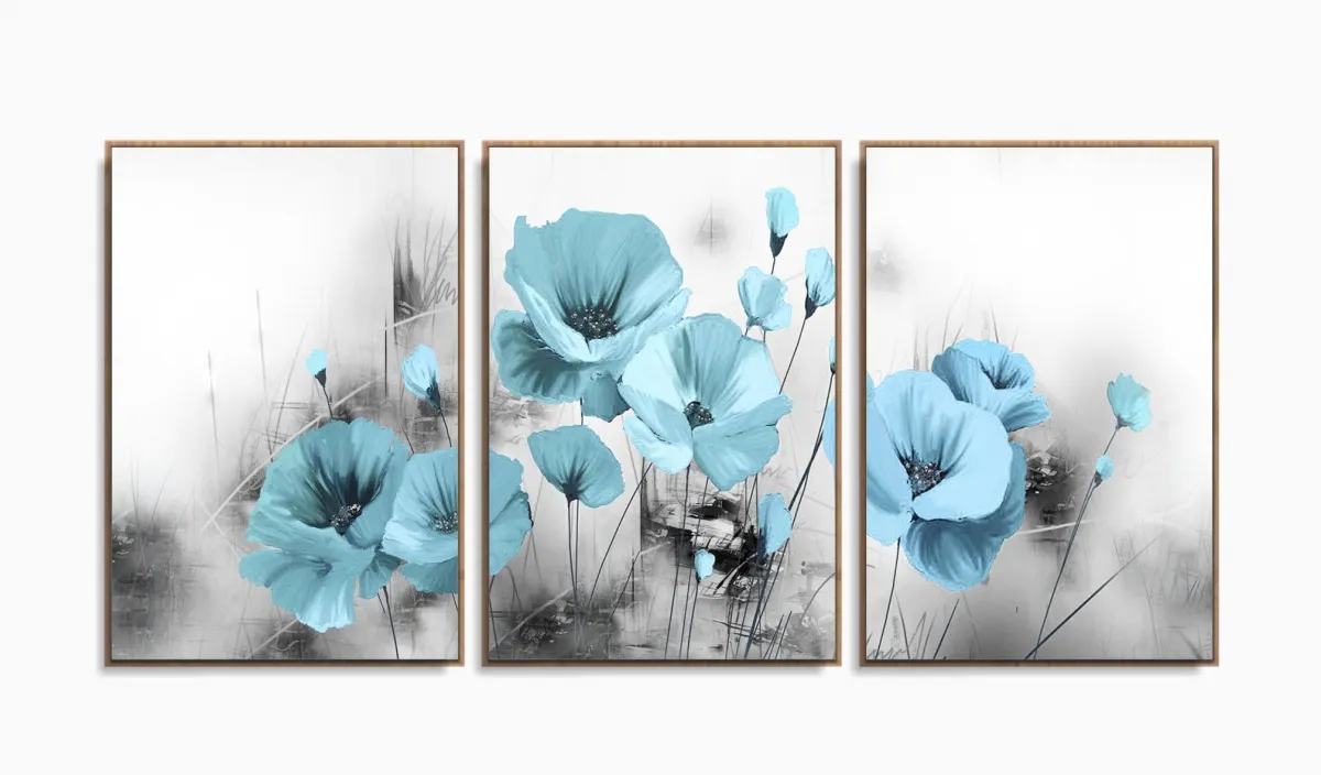Quadro Decorativo Flores Azul Claro 120x60 3 peças com moldura filete