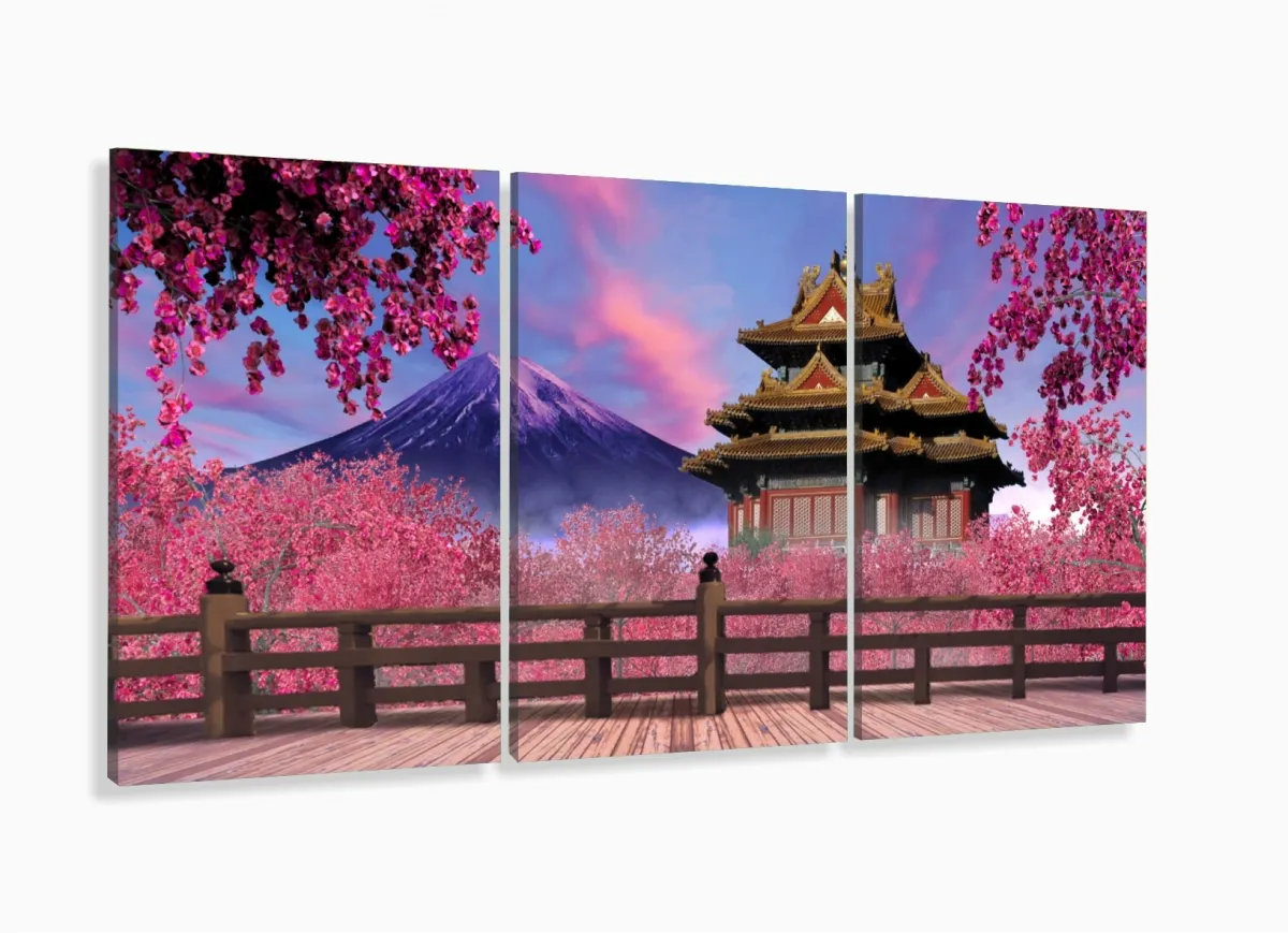 Quadro Decorativo Japão Sakura Fuji 120x60 3pç com moldura filete
