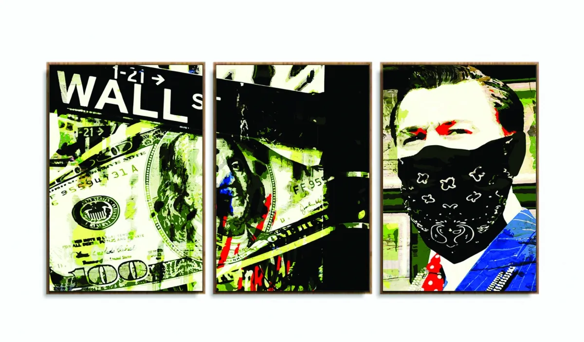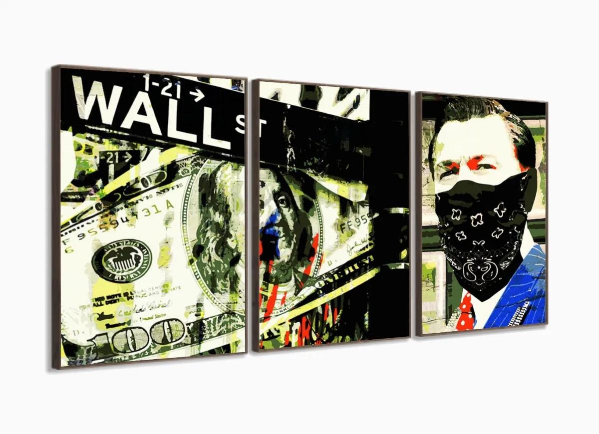 Quadro Decorativo Lobo Wall Street 3 Peças 120x60 Mosaico com moldura filete