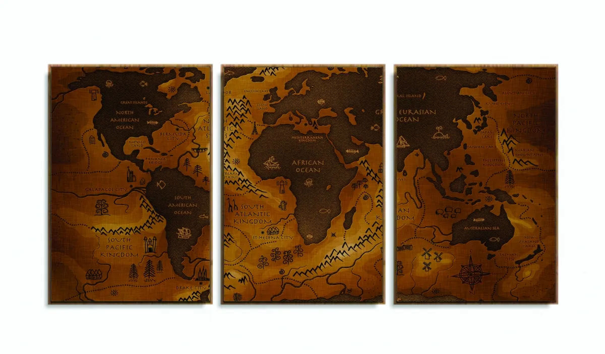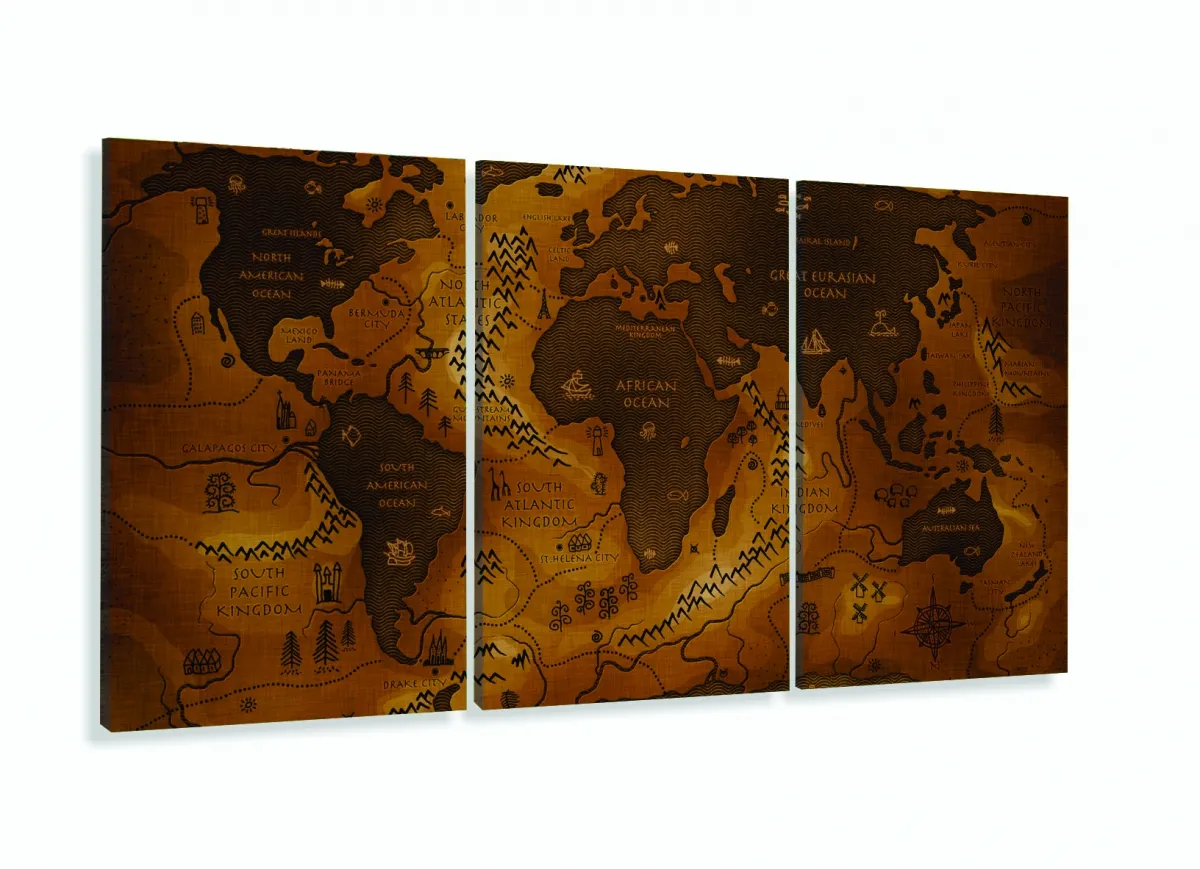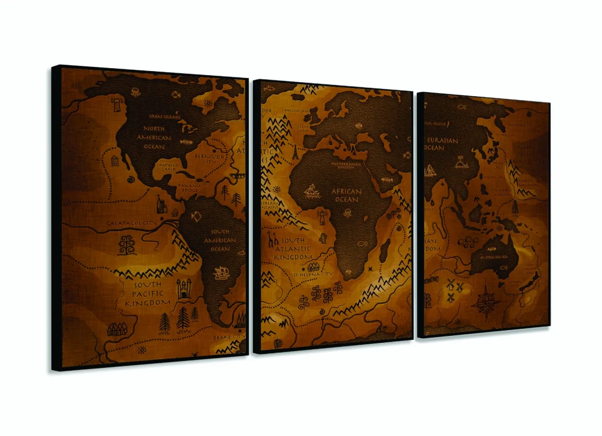 Quadros Decorativos Mapa Mundi Vintage Geografia 120x60 3 peças com moldura filete