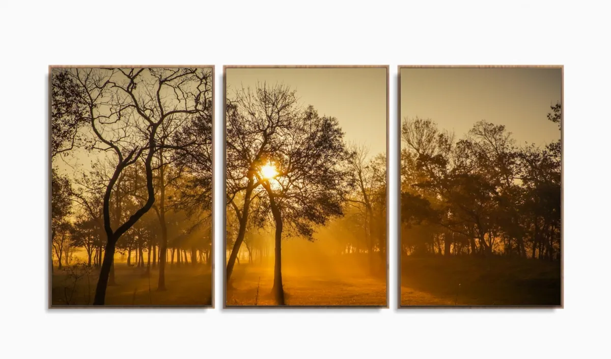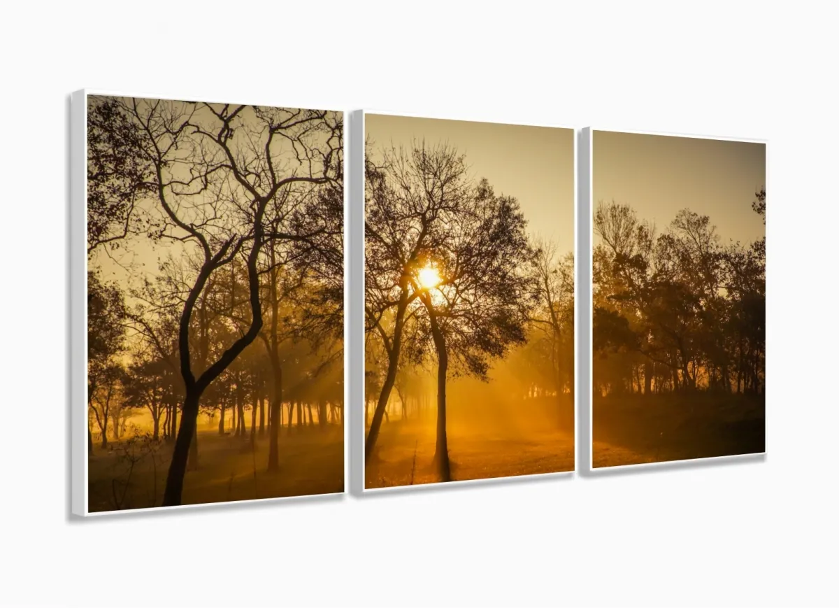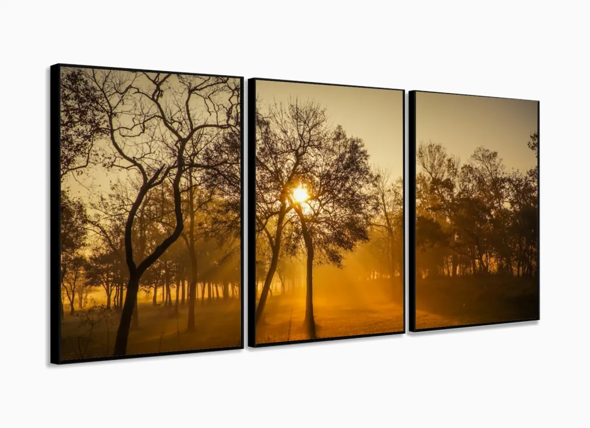 Quadro Decorativo Nascer Do Sol Na Floresta 120x60 3 peças Sala com moldura filete