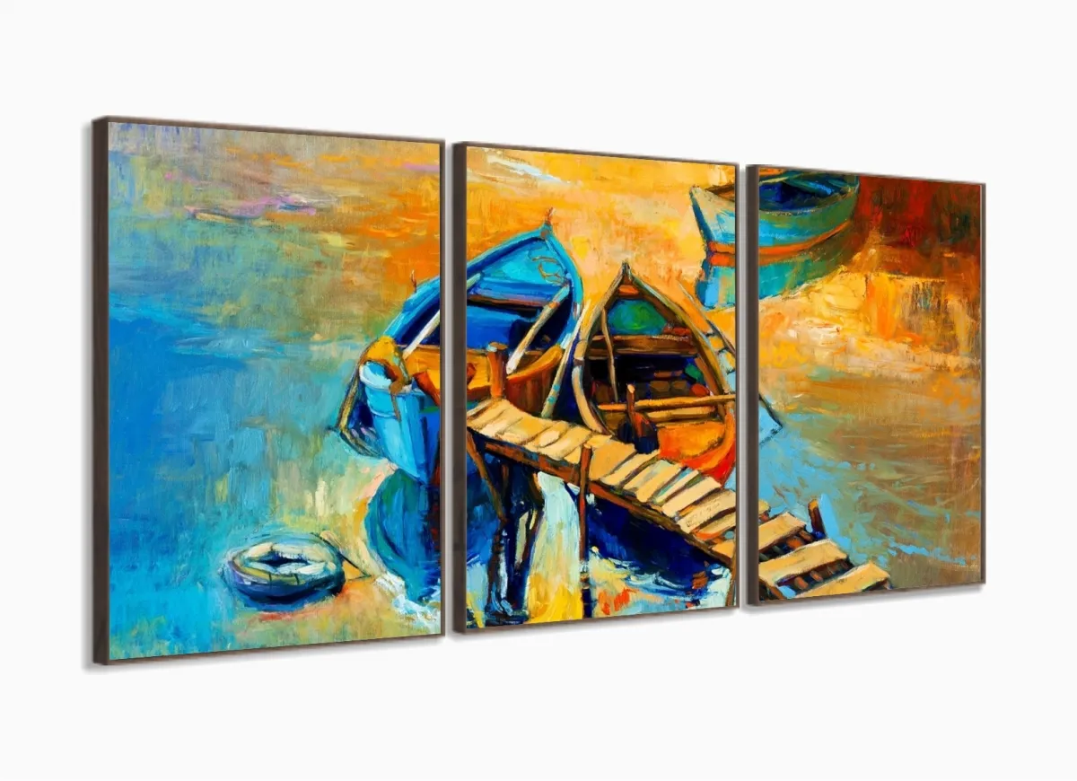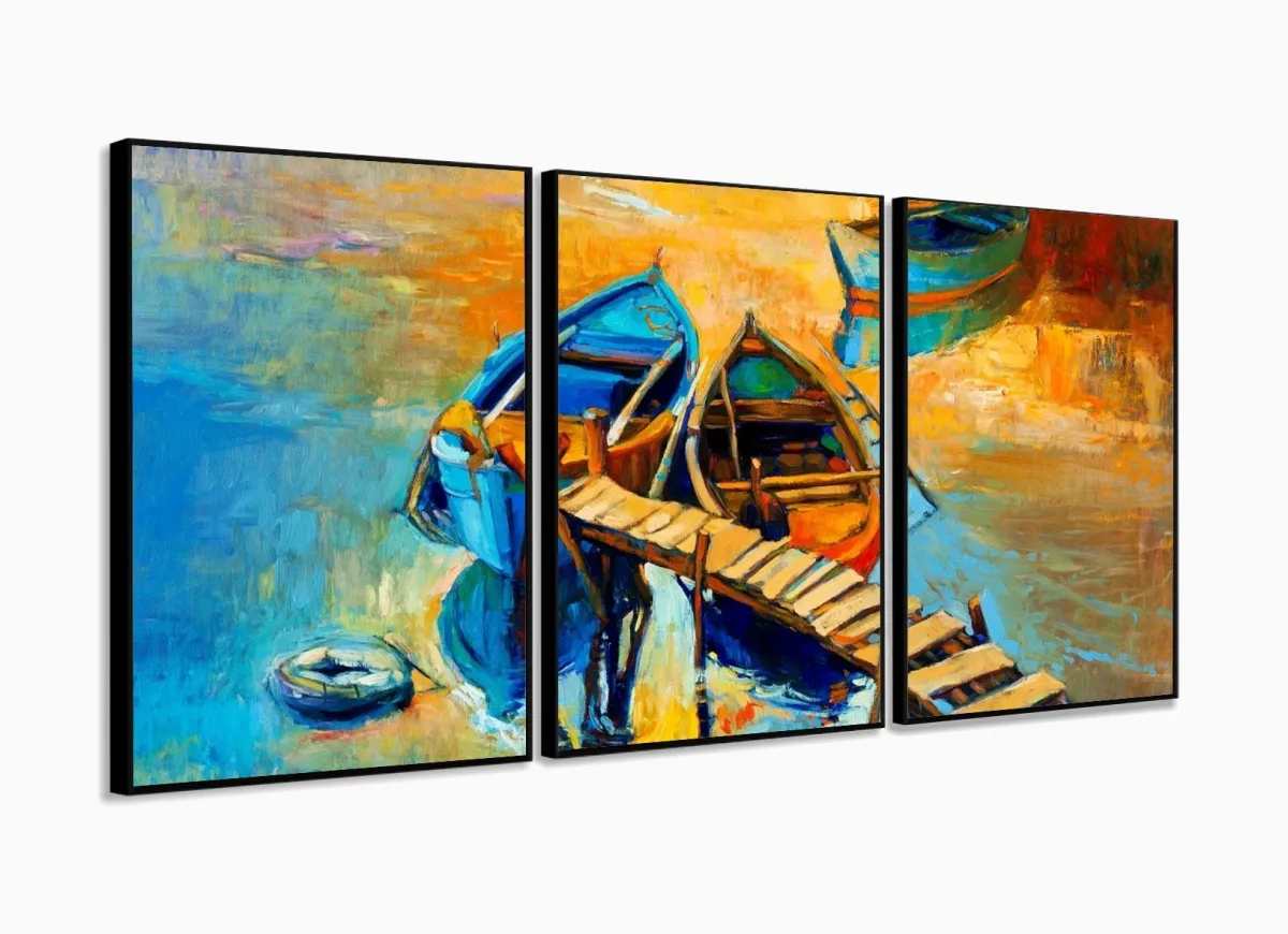 Quadro Decorativo Paisagem Canoas Entardecer Sala com moldura filete