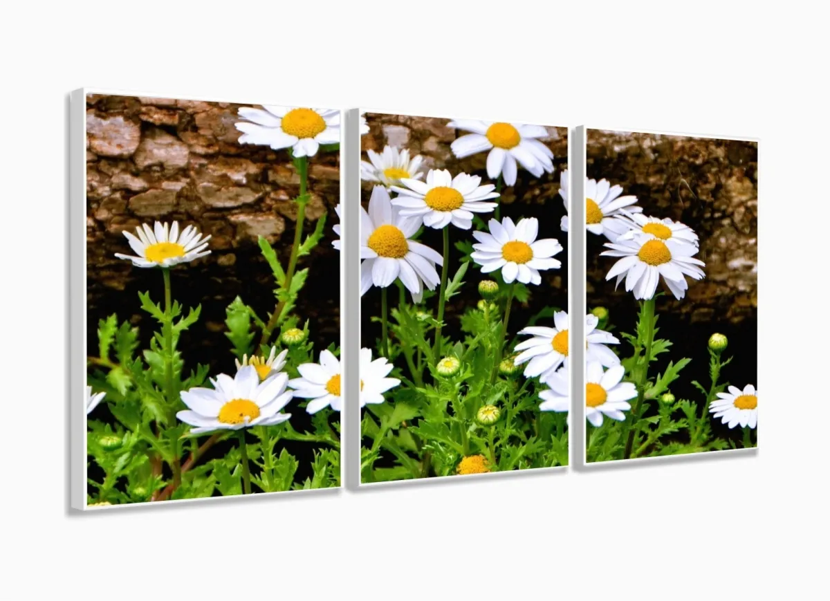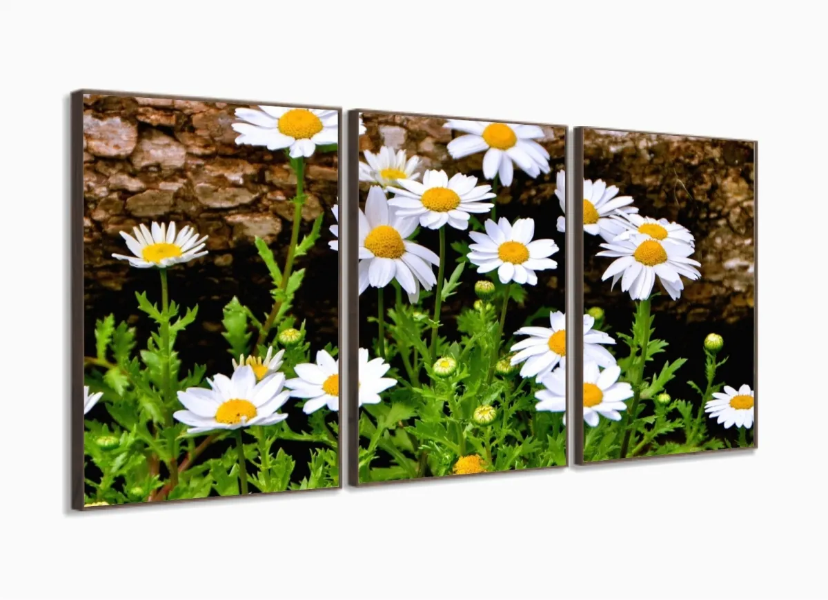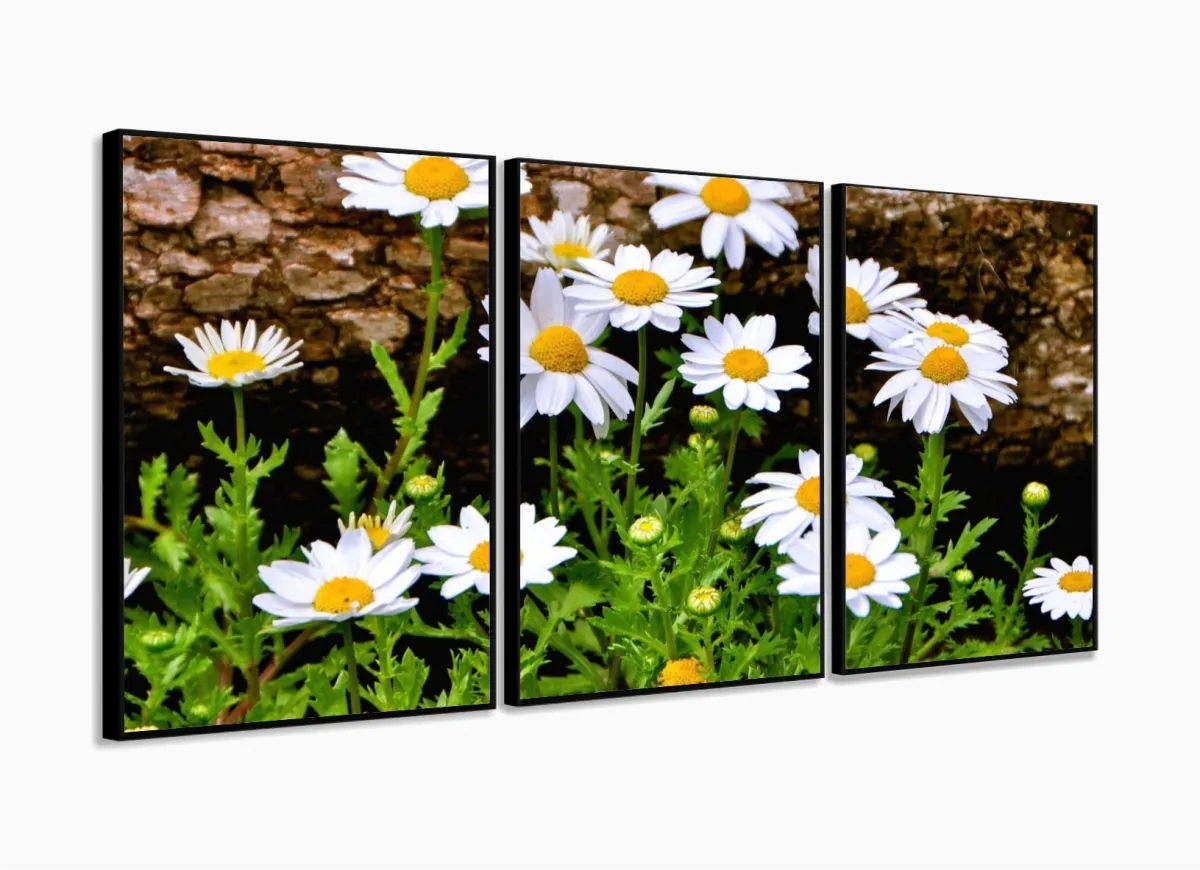 Quadro Decorativo Paisagem Flores Tela Em Tecido 3 Peças com moldura filete