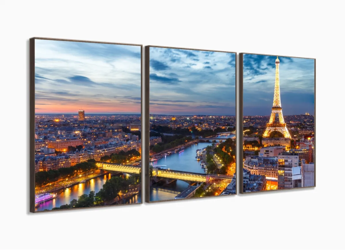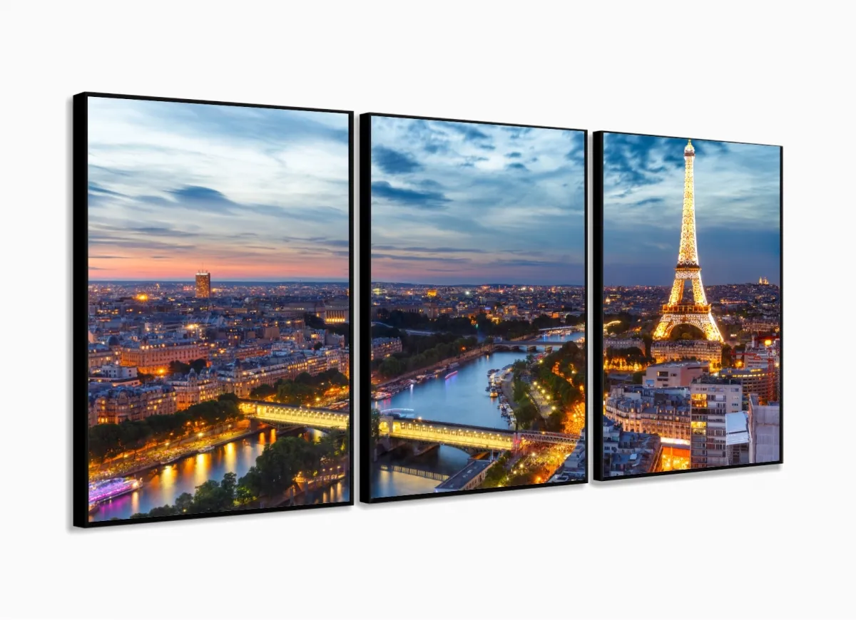 Quadro Decorativo Paris Paisagem Em Tecido 3 Peças com moldura filete