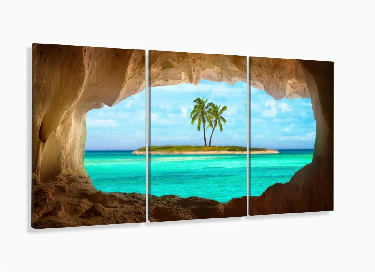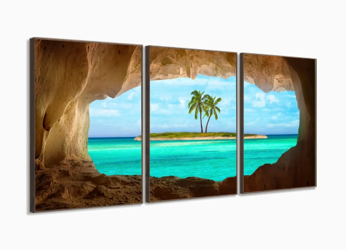 Quadro Decorativo Praia Ilha Azul 120x60 3 peças em tecido com moldura filete