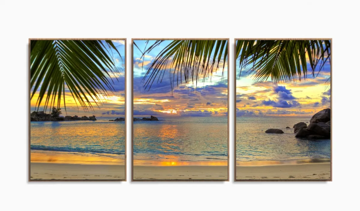 Quadro Decorativo Praia Mar Areia 3 pç 120x60 tecido com moldura filete