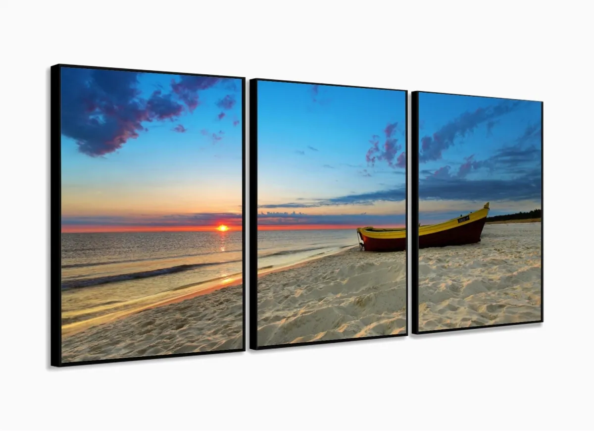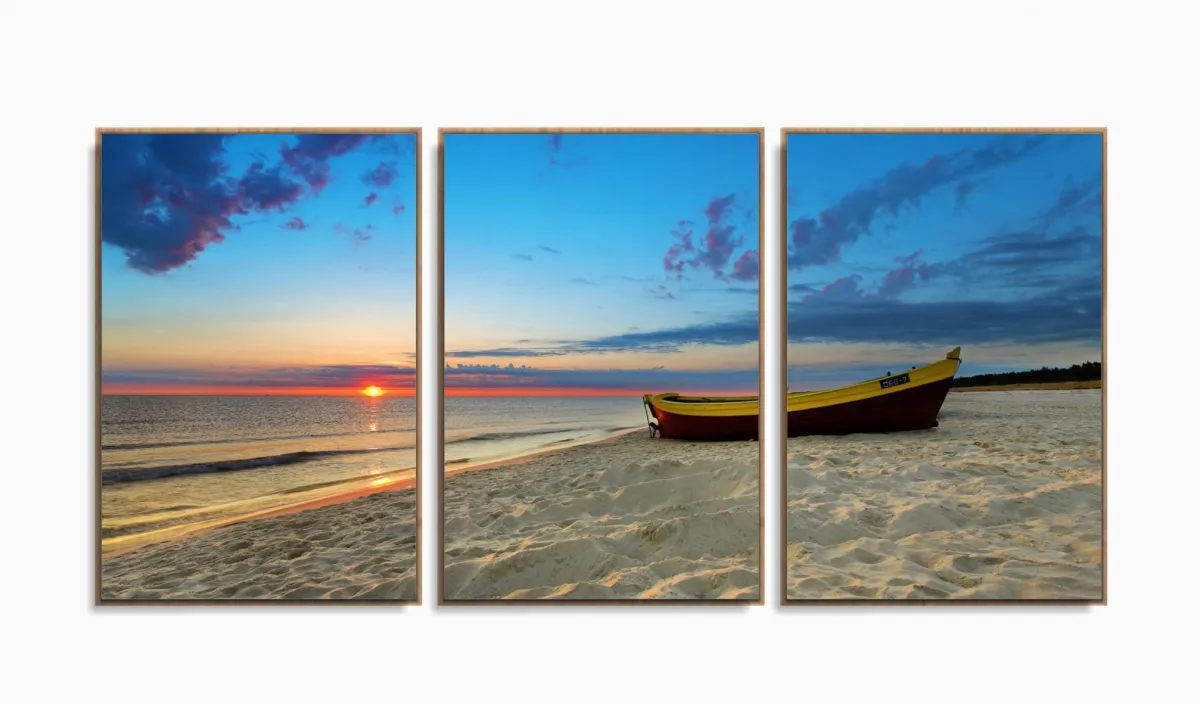 Quadro Decorativo Praia Mar Barco 120x60 em tecido com moldura filete