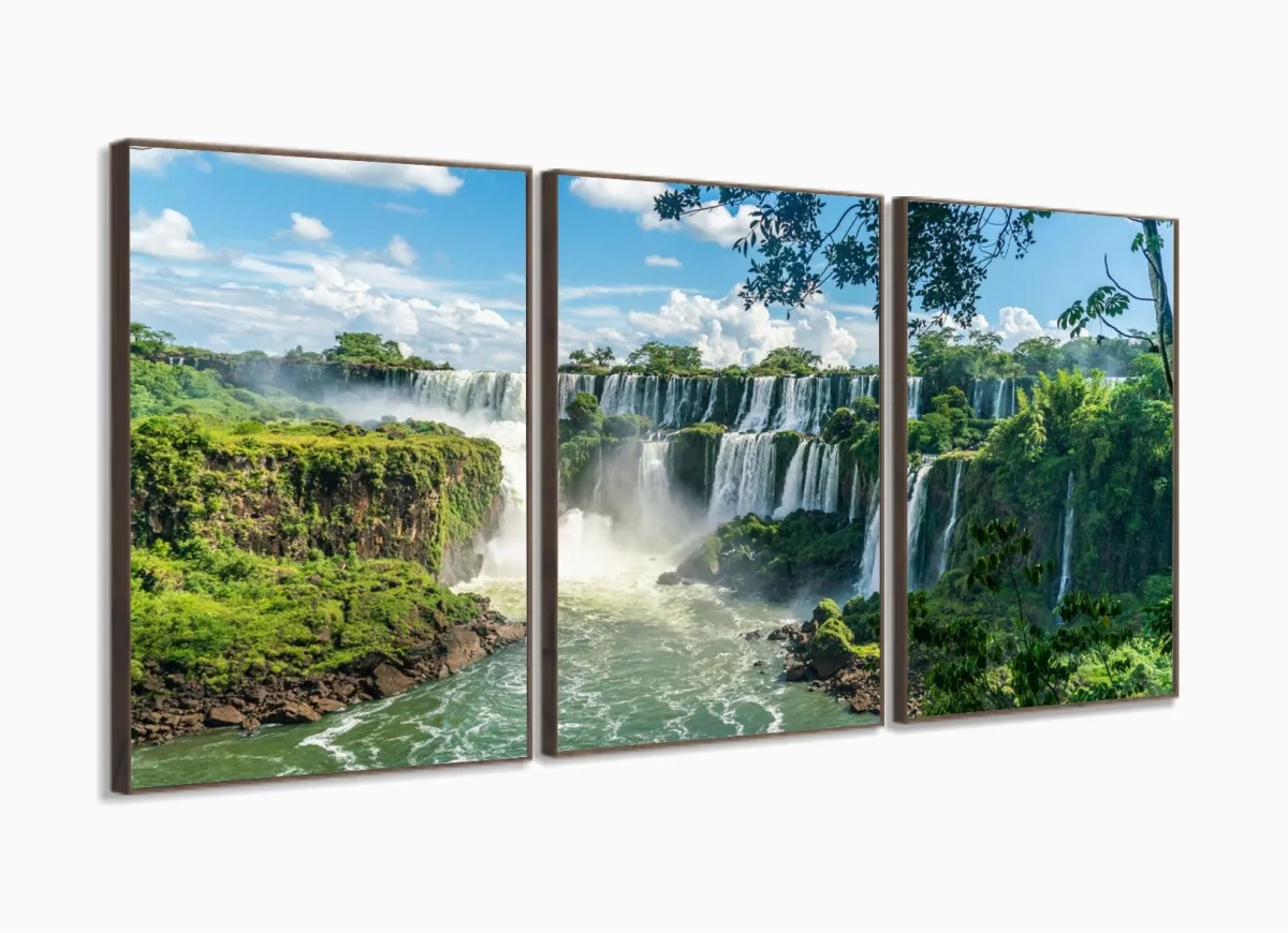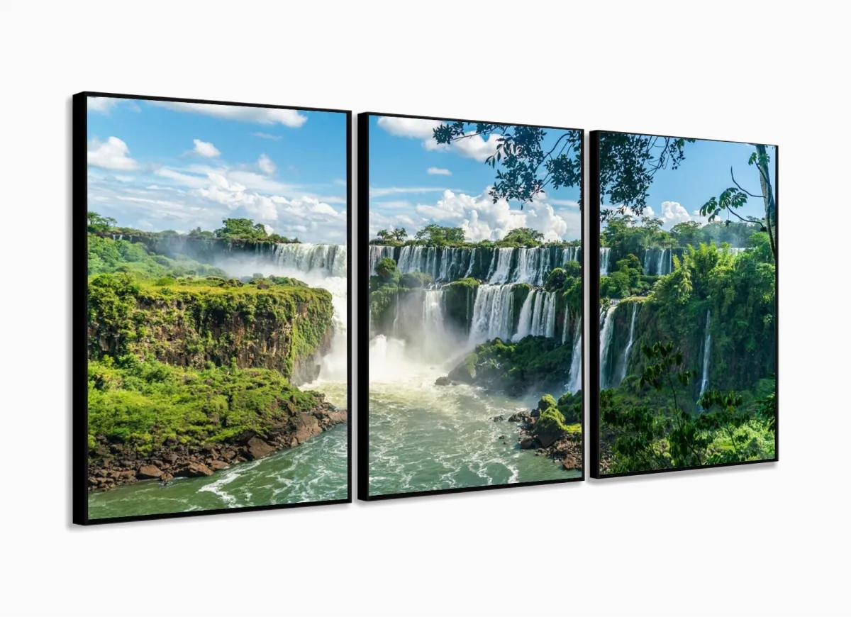 Quadro Decorativo Sala Quarto Escritório Paisagem Cachoeira 120x60 3 peças com moldura filete