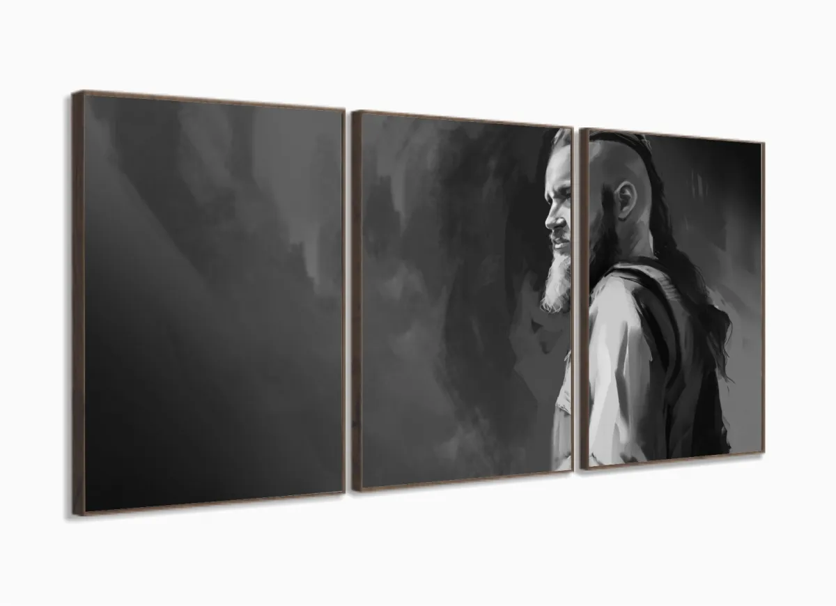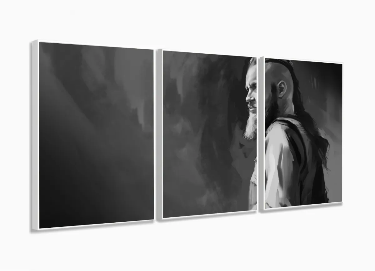 Quadro Decorativo Vikings Ragnar Artístico - Tela Em Tecido 3 peças com moldura filete