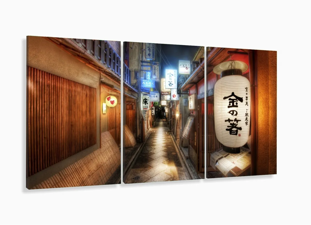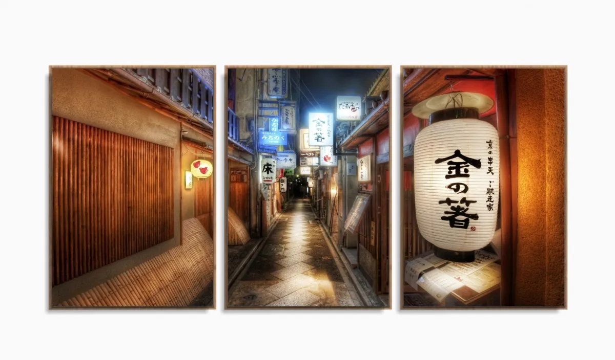 Quadro Decorativo Vintage Streets Of Kyoto - Tela Em Tecido 3 peças com moldura filete