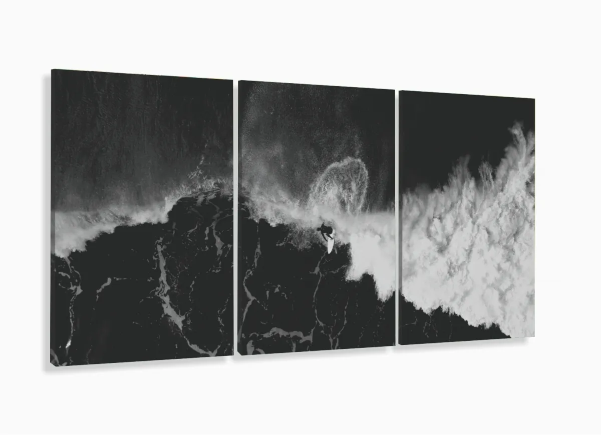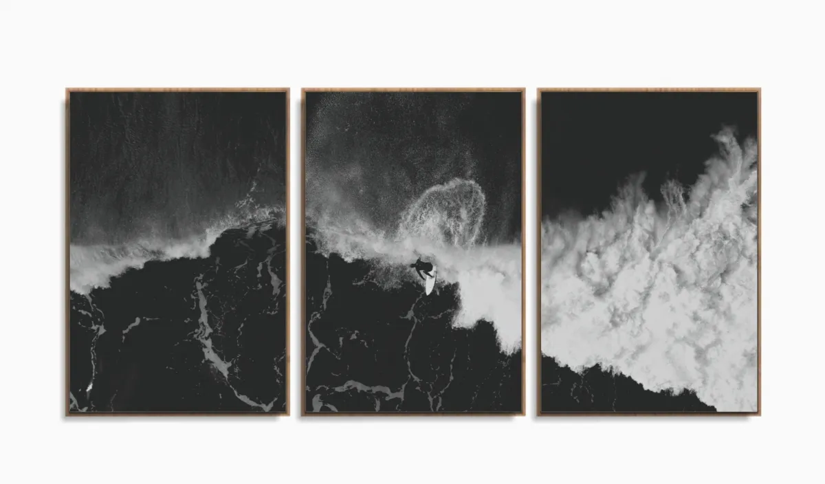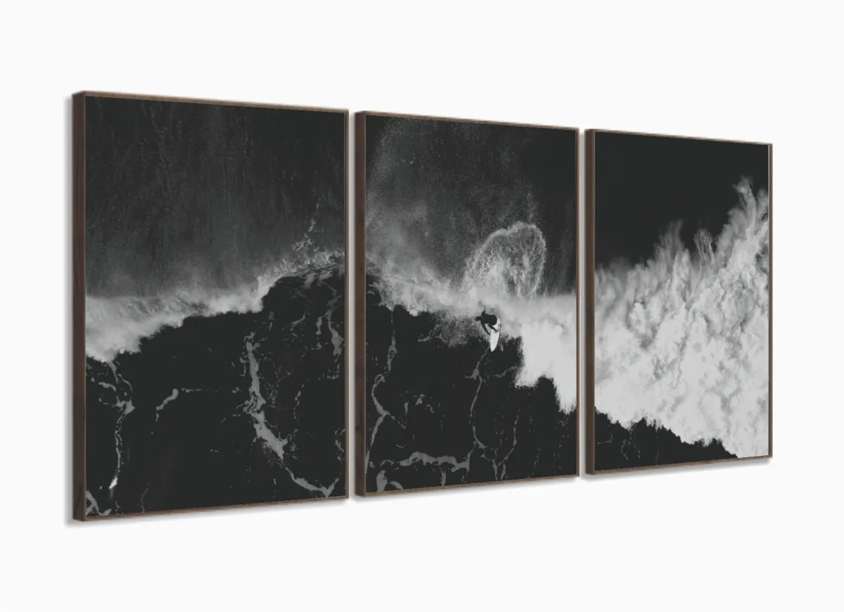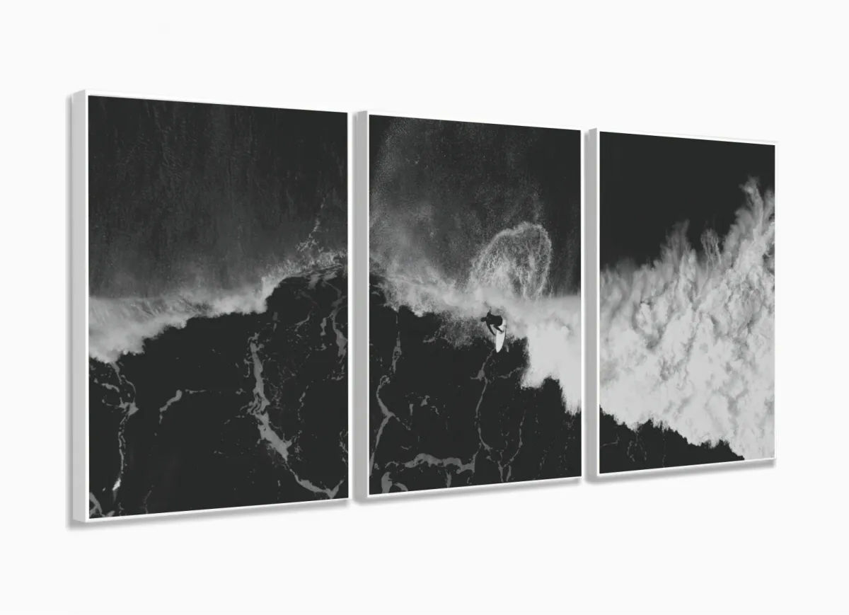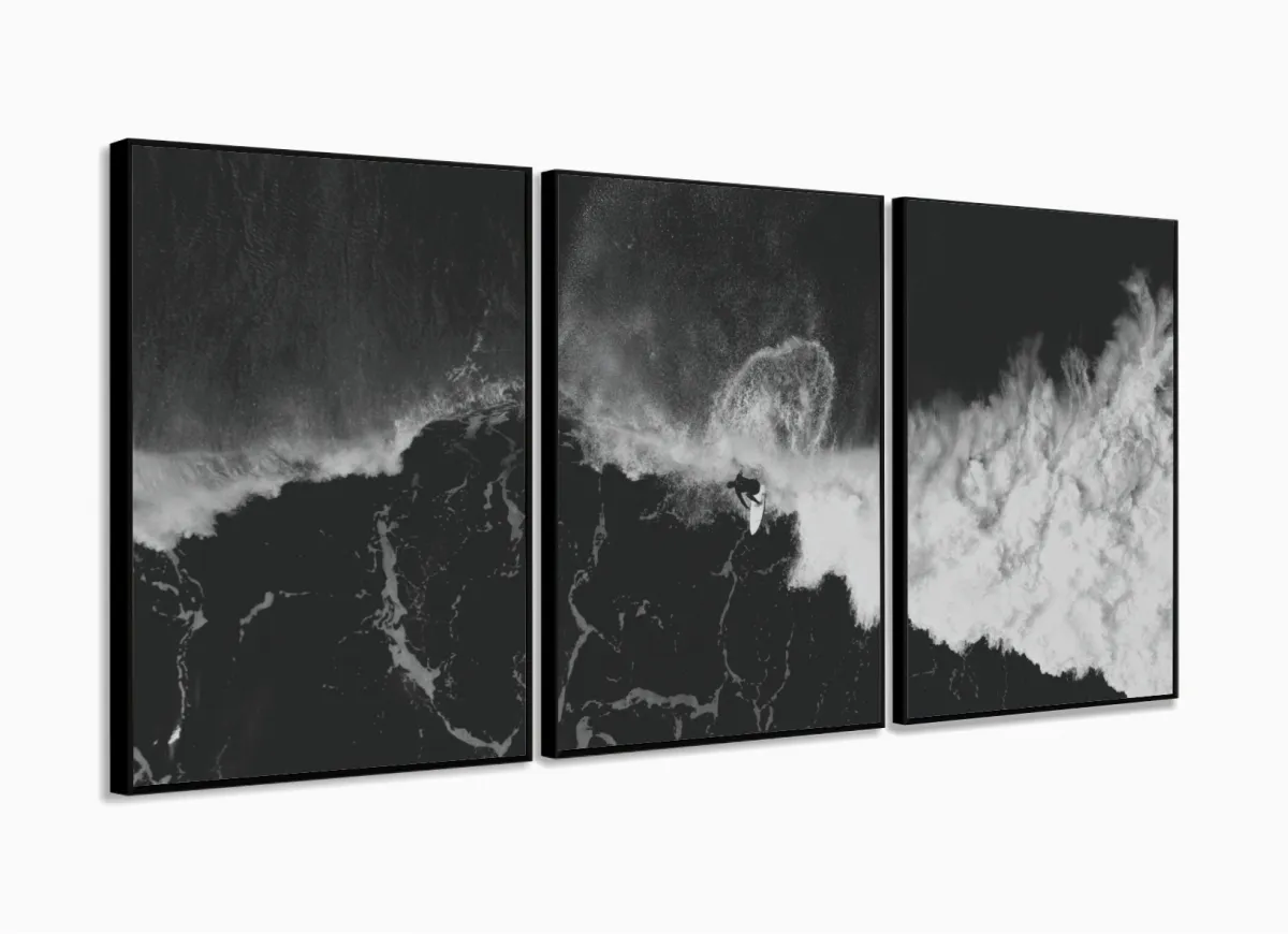 Quadro Em Tecido Surf Preto E Branco Onda Praia Sala Quarto 3 peças com moldura filete