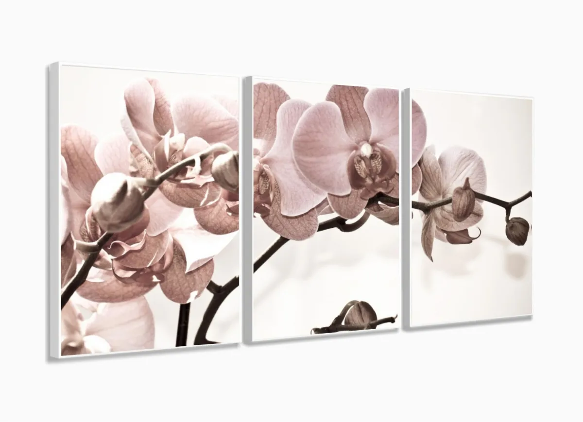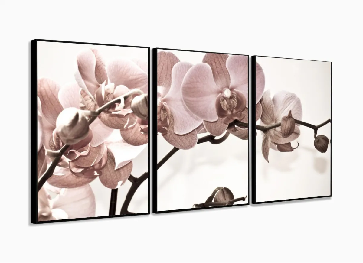 Quadro Flores Orquídeas Para Sala Recepção Tecido 120x60 em tecido 3 peças com moldura filete