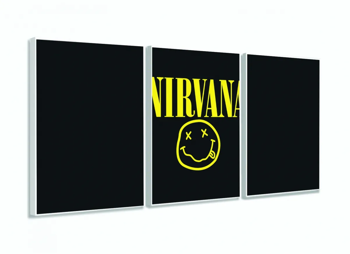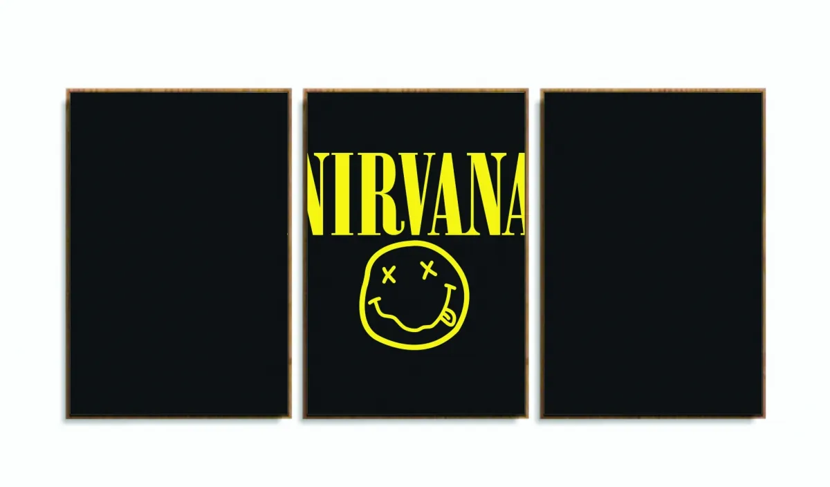 Quadro Nirvana Música Banda Decorativo Em Tecido 3 Peças com moldura filete