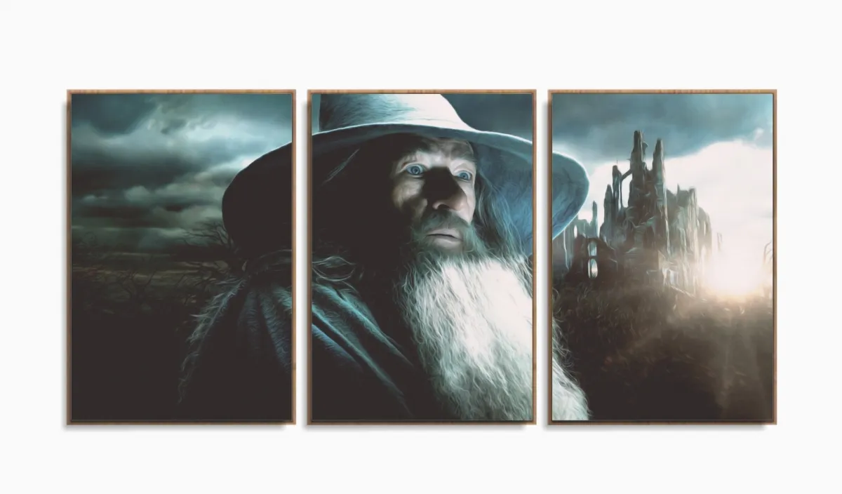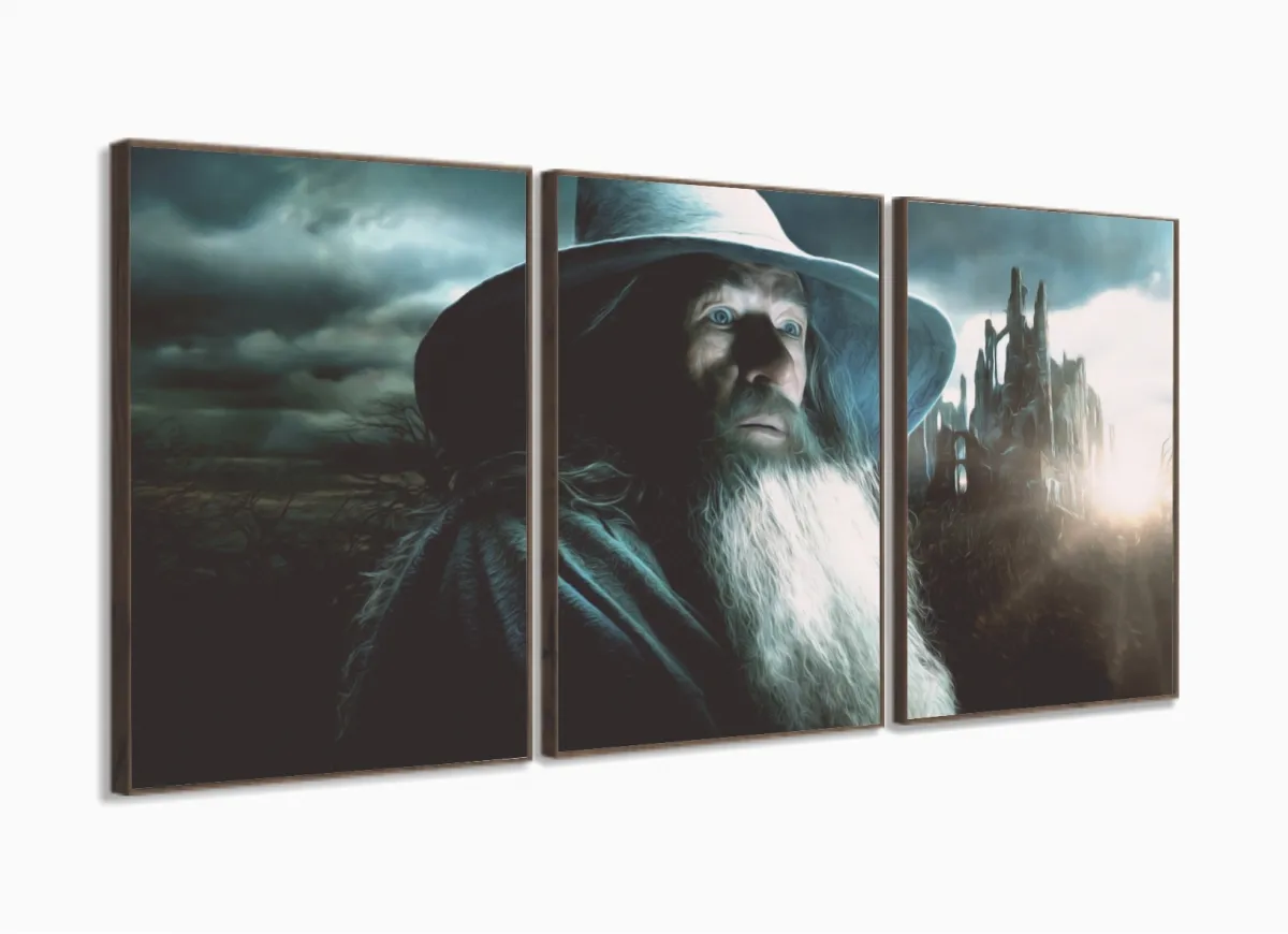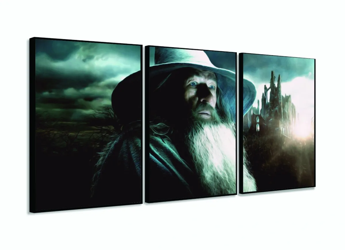 Quadro Senhor Dos Anéis Gandalf Hobbit Para Quarto 120x60 3 peças com moldura filete