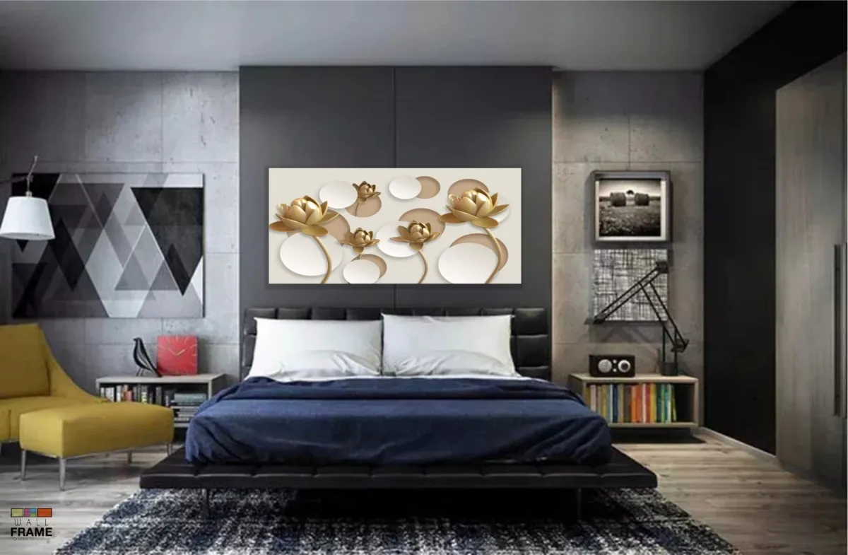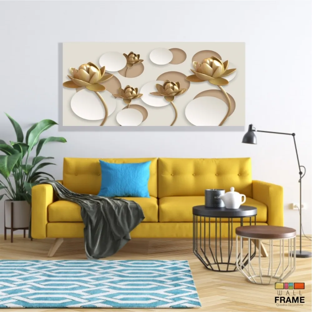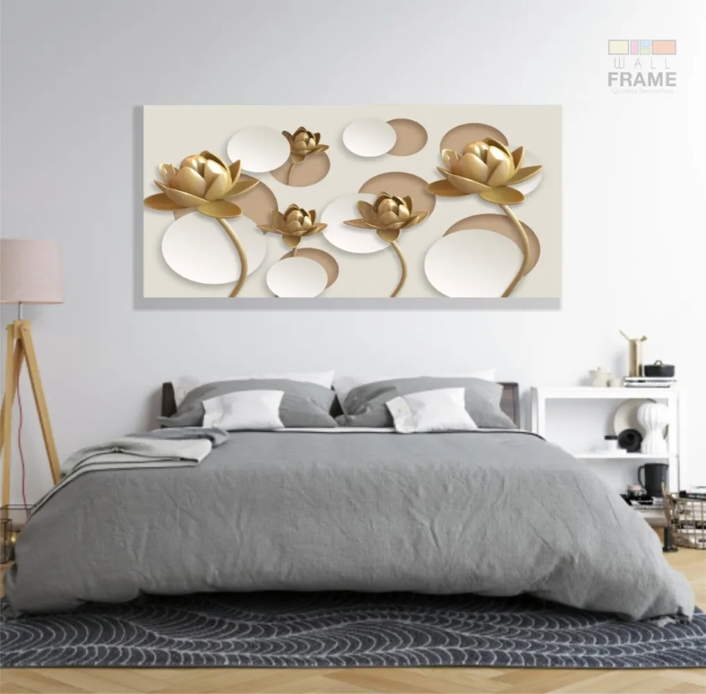 Quadro Decorativo Flores Douradas em Tecido Canvas 130x60 cm