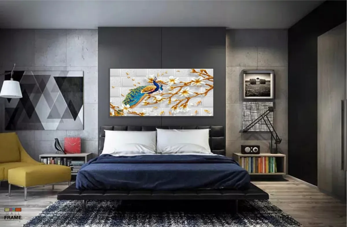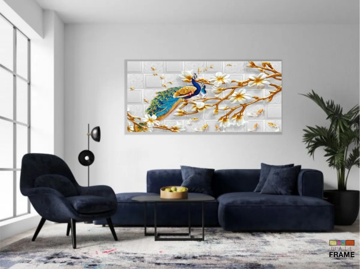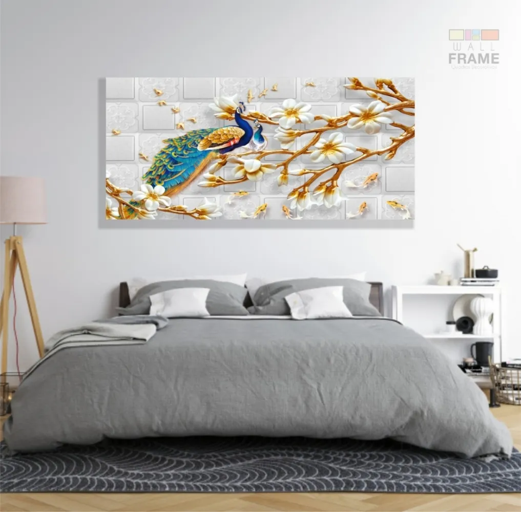 Quadro Decorativo Pavão Artistico Luxo em Tecido Canvas 130x60 cm