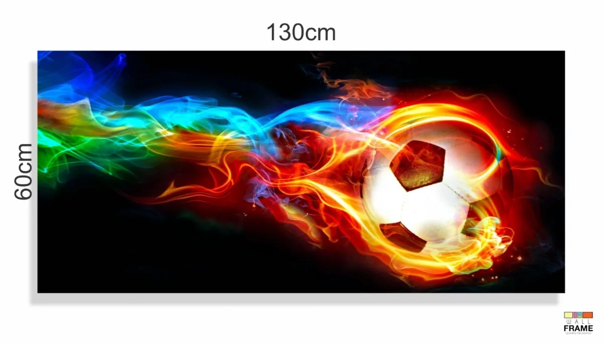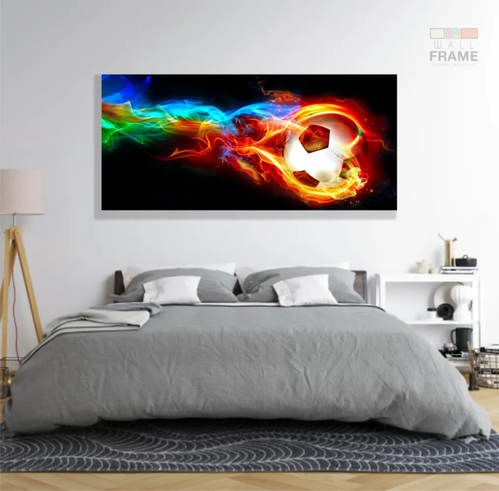 Quadro Decorativo peças Bola Futebol Fogo em Tecido Canvas 130x60
