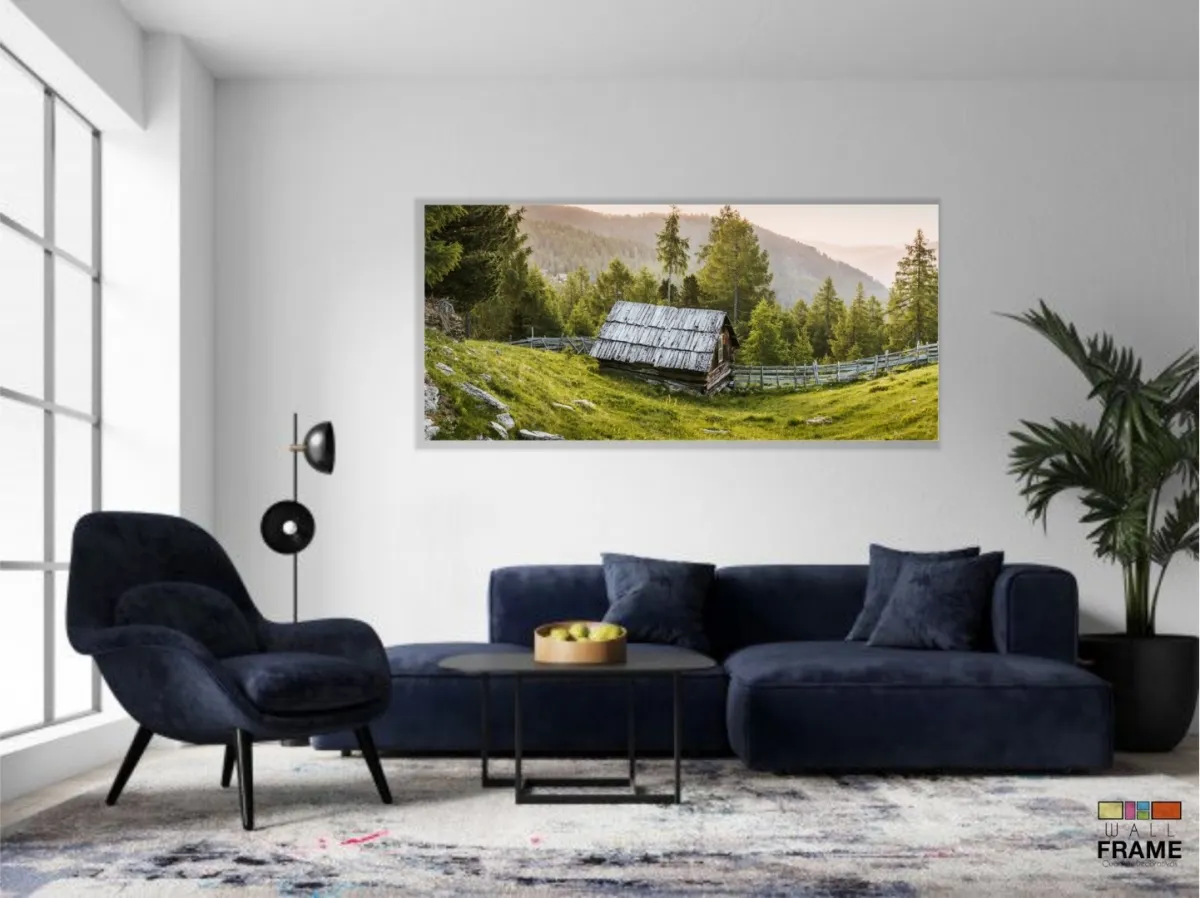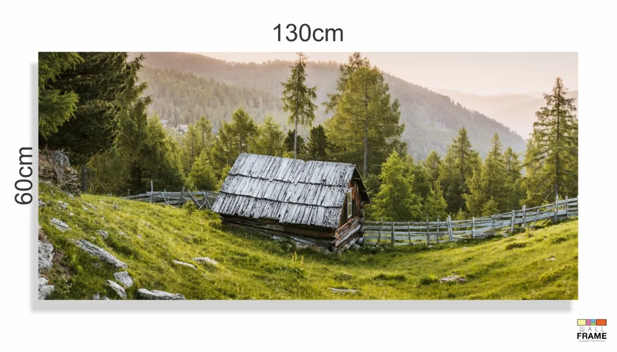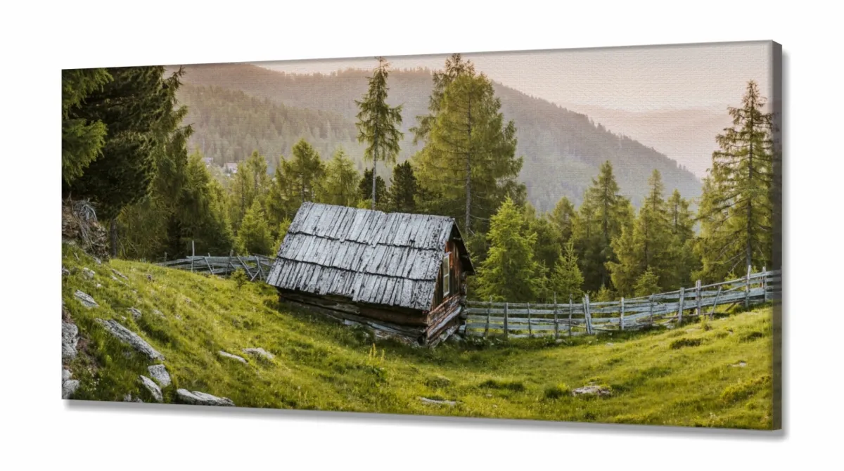 Quadro Paisagem Montanha Cabana Natureza Nascer do Sol em Tecido Canvas 130x60