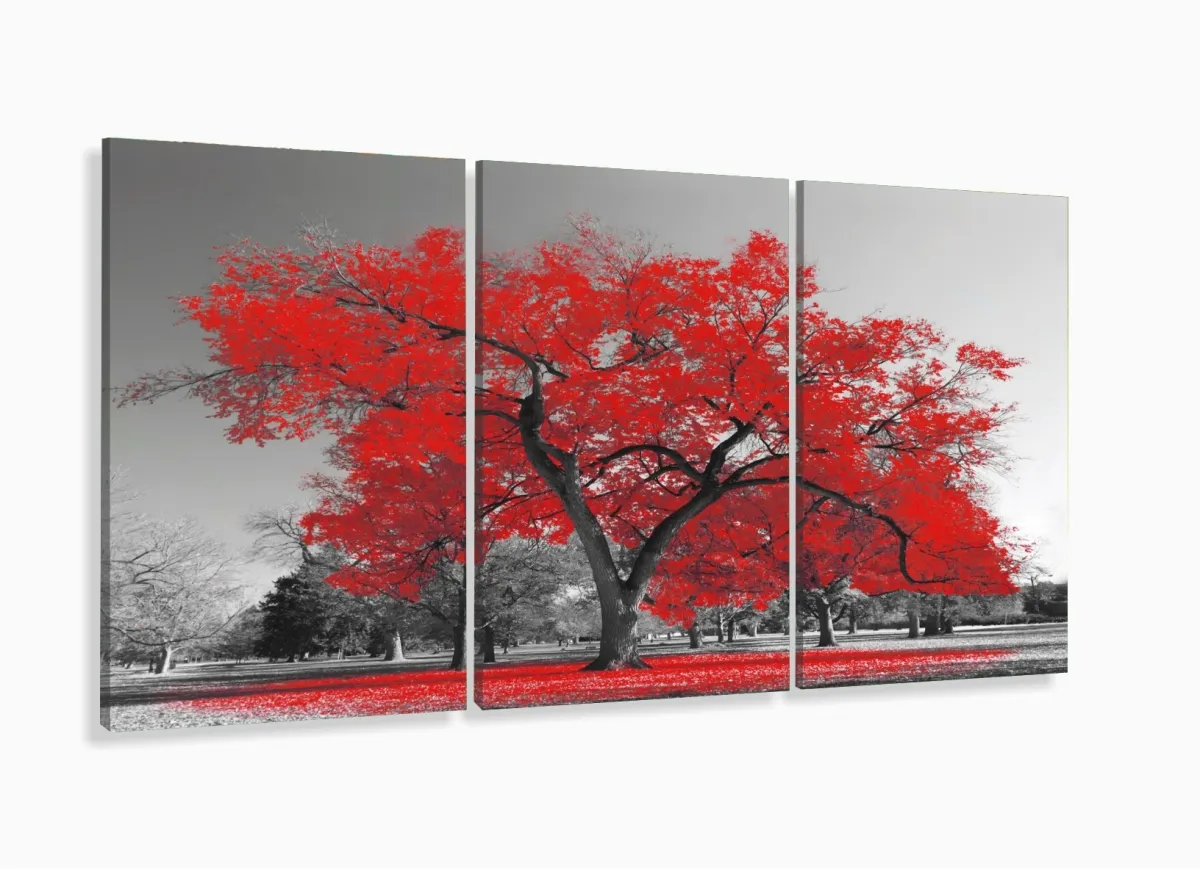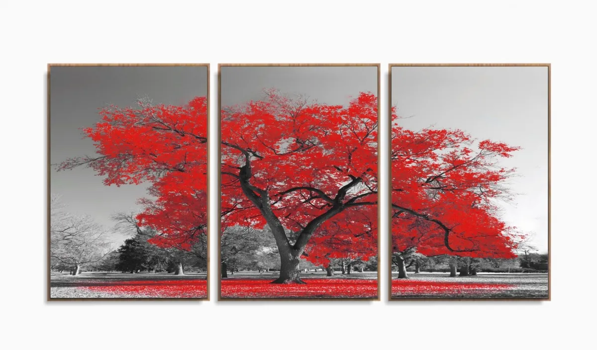 Quadros Decorativos Arvore Vida Vermelho Sala 120x60 3 peças com moldura filete