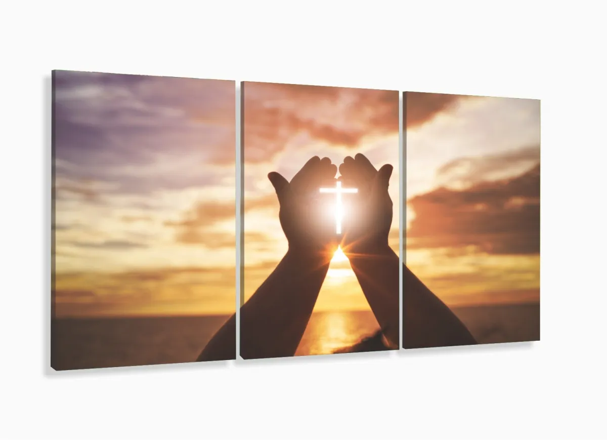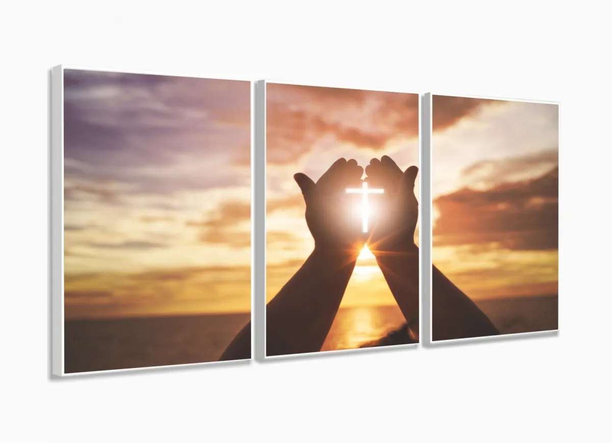 Quadros Decorativos Cruz Pôr do Sol Jesus Sala Quarto 120x60 3 peças com moldura filete