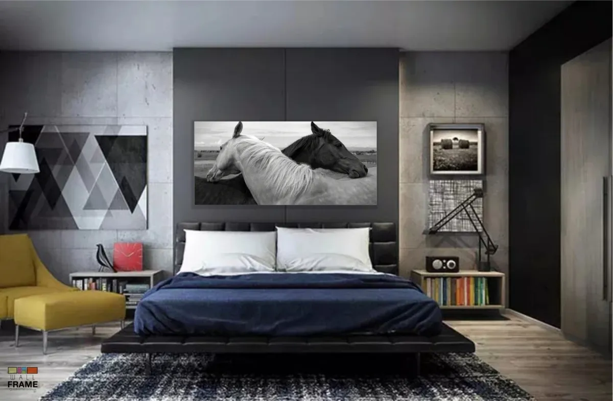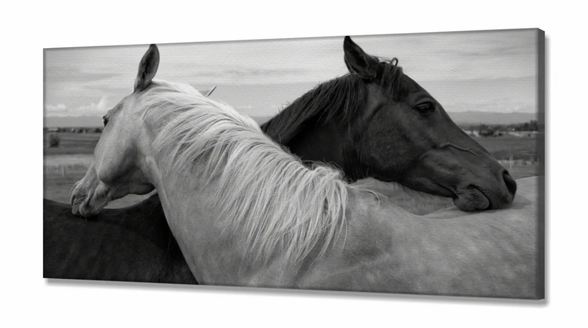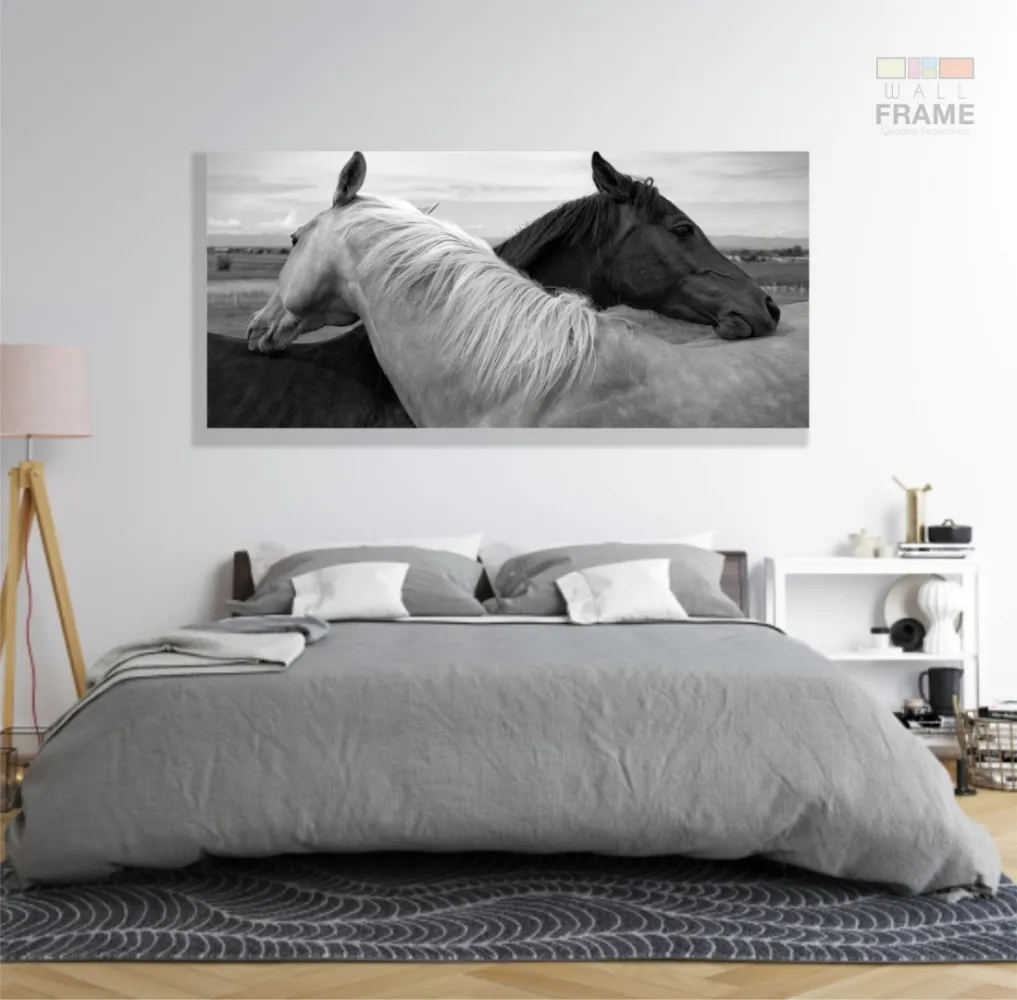 Quadros Decorativos Cavalo Preto e branco em Tecido Canvas 130x60